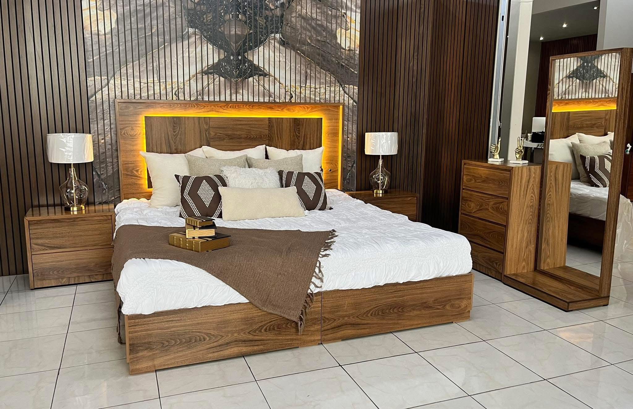 Incluye 5 piezas: Cabecera, dos burós, Espejo y Cómoda